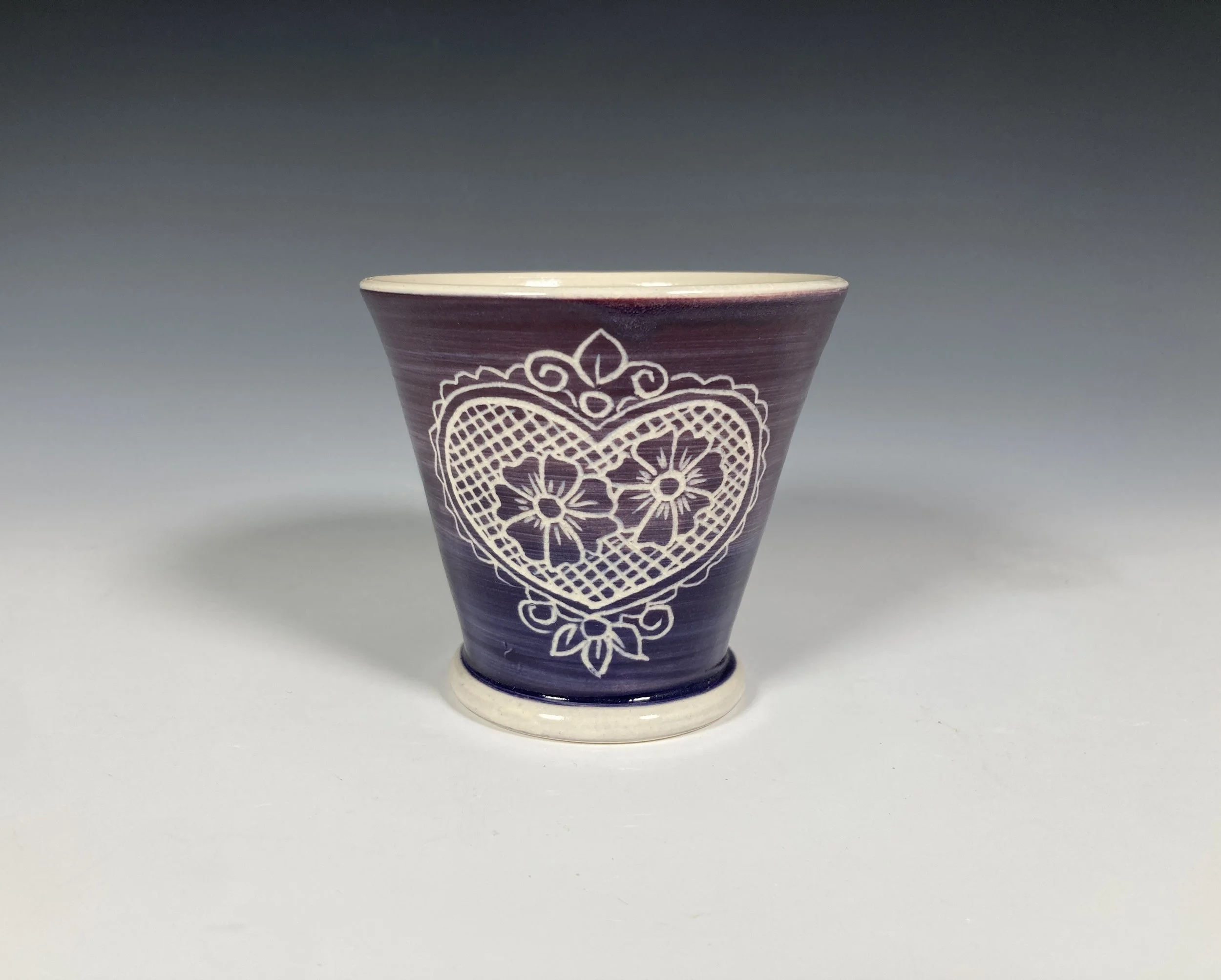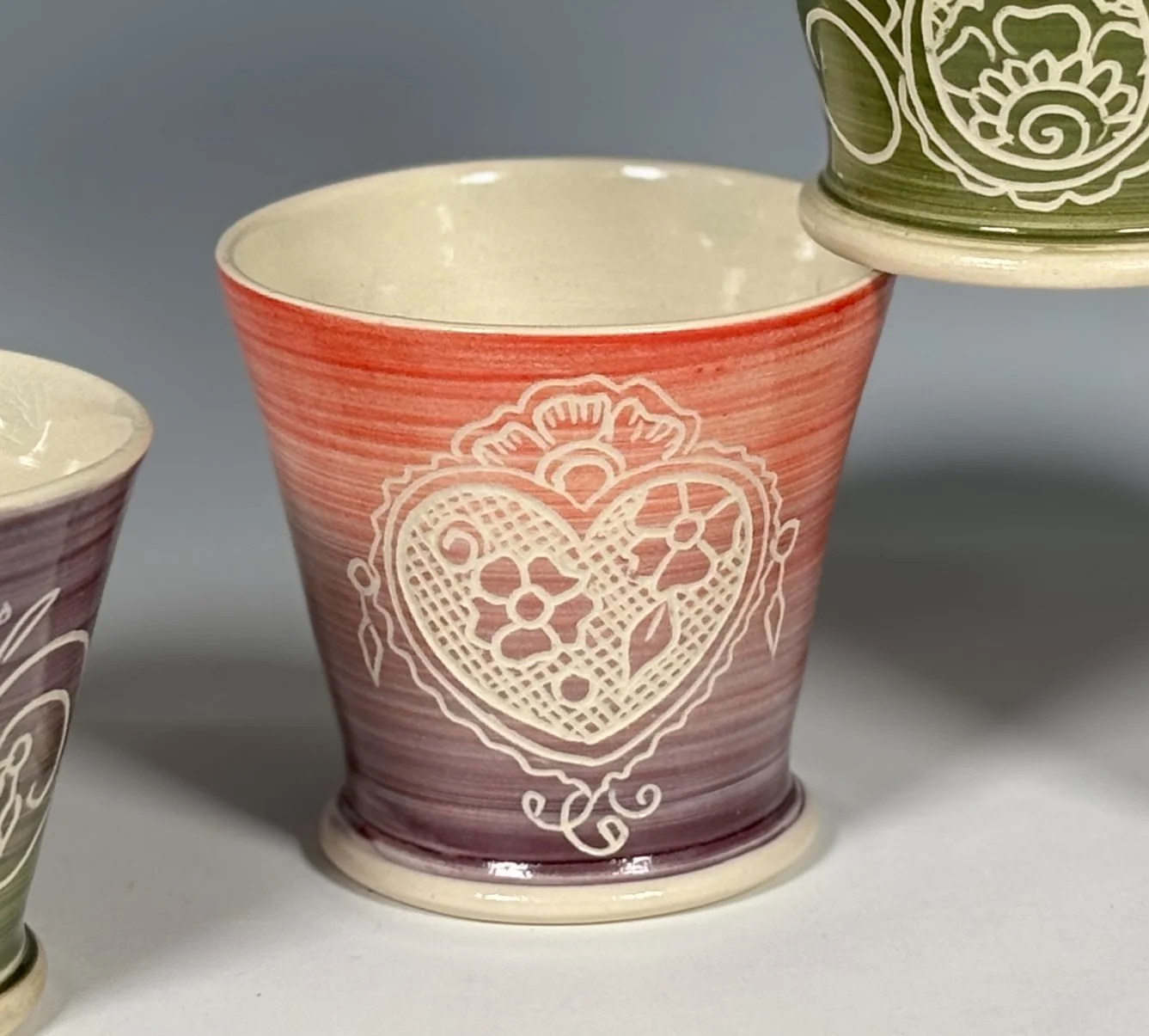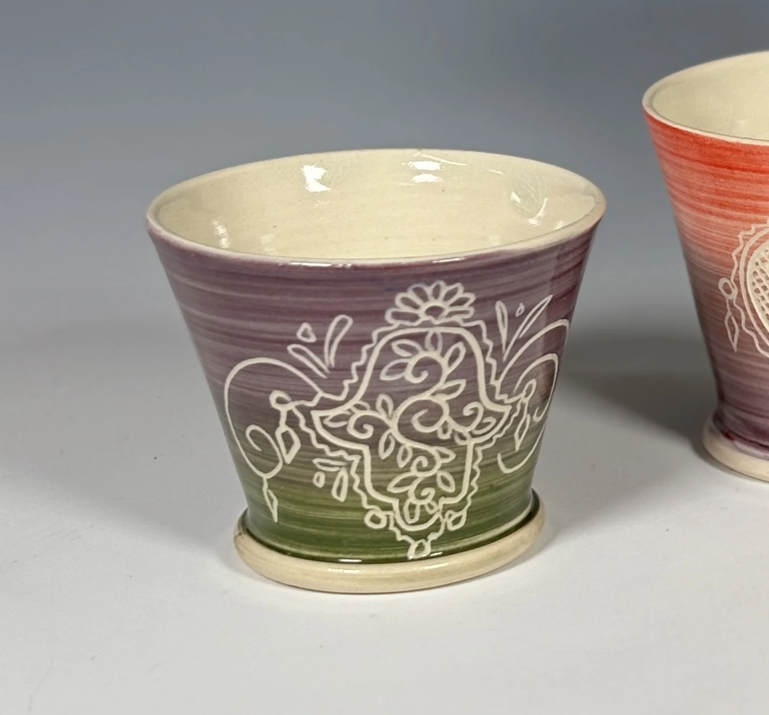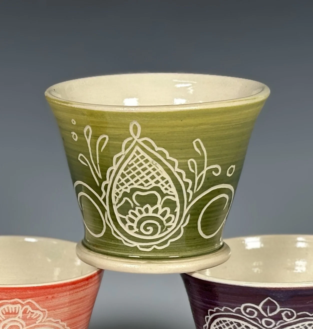 All of my “hennapottery” mugs are individually handmade on the potter’s wheel. Each is freehand carved with a henna-inspired design through a veneer of vivid colors. They are then glazed with a simple clear glaze to highlight the details of the carving. Each is unique and sizes will vary slightly due to their handmade nature. They are approximately 3 1/2 inches in diameter at the rim and around 4.5 to 5 inches tall. They hold about a cup and a half of liquid. Safe to use in microwave and dishwasher. FREE SHIPPING within the continental US.